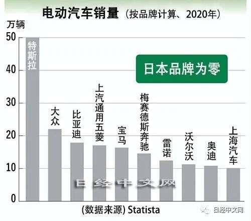 从2020年各品牌的纯电动汽车(包括插电式混合动力车)销量来看,纯电动汽车专业厂商美国特斯拉以压倒性优势排在首位。2020年推出战略车“ID.3”的德国大众(VW)排在第2位。行业版图呈现出世界大型企业对阵新兴企业的新局面。