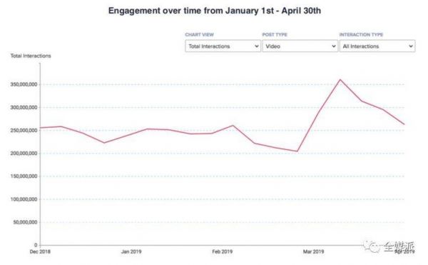 从2019年1月1日至4月30日,除了三月末的一次下降及四月中的一次飙升,Facebook上视频的参与度趋向平稳,互动量保持在每周两亿五千万次左右,与年初持平。