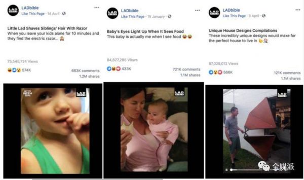 病毒视频依旧能打当把目光转向Facebook上视频互动量最高的账号,英国媒体LADbible赢得很明显。LADbible青睐“病毒视频”(viral video),尤其是与萌娃和宠物相关的搞笑短视频,往往能通过社交媒体的病毒式传播获得巨大流量。