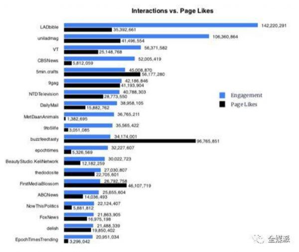 例如,CBS News和MetDaanAnimals的粉丝数相对较少,但却有相当高的互动量;而BuzzFeed Tasty的粉丝数倍于前两者,互动量却不及它们。