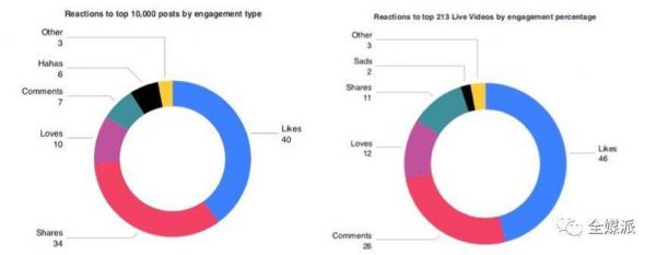 换个角度,将用户对视频整体及直播视频的反应相比较,NEWS WHIP得到两幅截然不同的图像。在所有视频中,用户的互动方式分别是喜欢、分享、点赞、评论、愉悦及其他;而如果将直播视频单独作为一个主体,用户的互动方式则变成了喜欢、评论、点赞、分享、悲伤及其他。