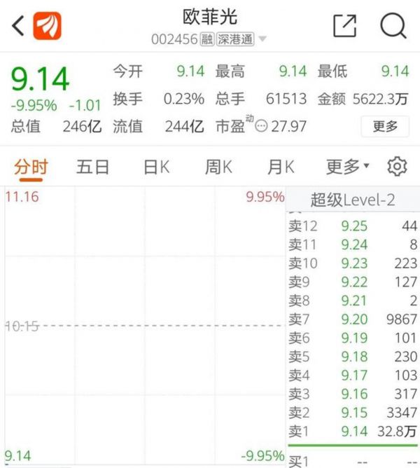 欧菲光今日开盘一字跌停,报9.14元,该公司此前被曝遭苹果产业链剔除。
