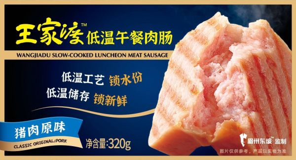 低温午餐肉是王家渡食品首款招牌预制菜品,于2016年正式推出。据梁棣介绍,该款产品采用分子料理低温加工工艺,是国内首款采用低温工艺熟制的午餐肉肠,0-4℃温层保存,保质期在5个月,熟制过程中水分流失小于5%,此后王家渡食品还推出低温川味香肠。相较于传统常温、冷冻肉制品,这两款产品在锁鲜同时,做到了零香精、零色素添加。
