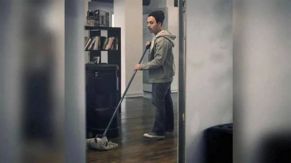 2010年,Shopify 首席运营官 Harley Finkelstein在 Shopify 办公室拖地 图源:Shopify