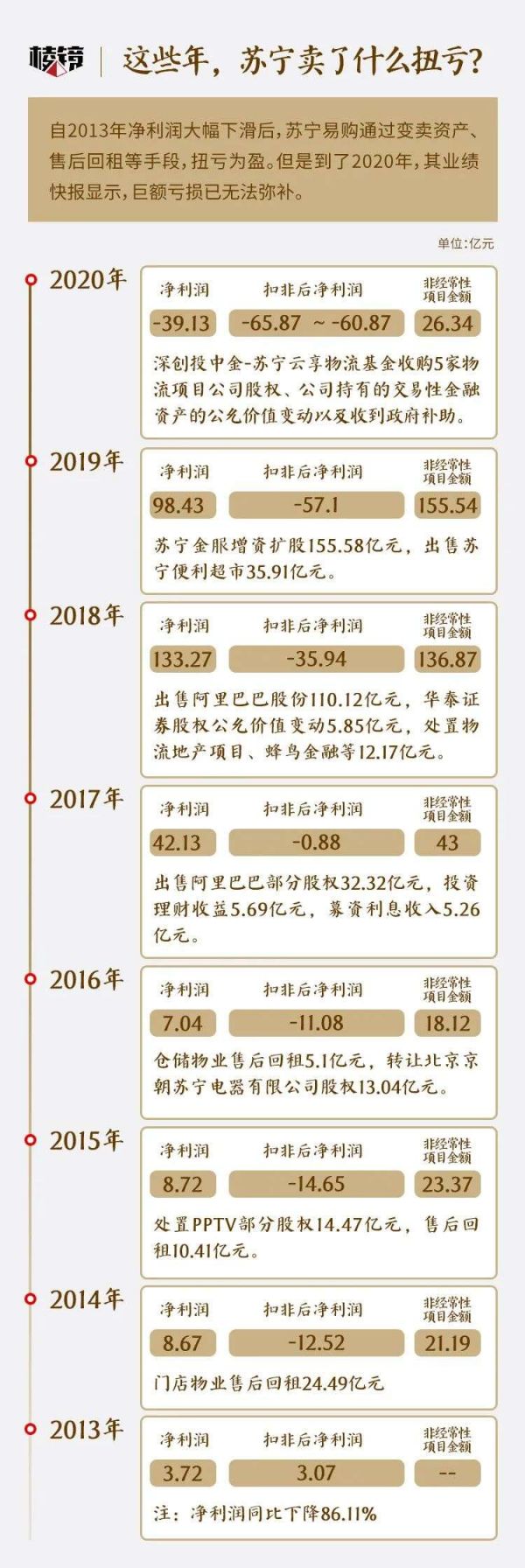 根据苏宁易购的财报,2013年其净利润同比骤降了95.84%。而在第二年,其扣除非经常性损益的净利润已经是-12.52亿元,自此之后,这个数据就再没有再变正,这也意味着苏宁的主业已经连续亏损了7年。