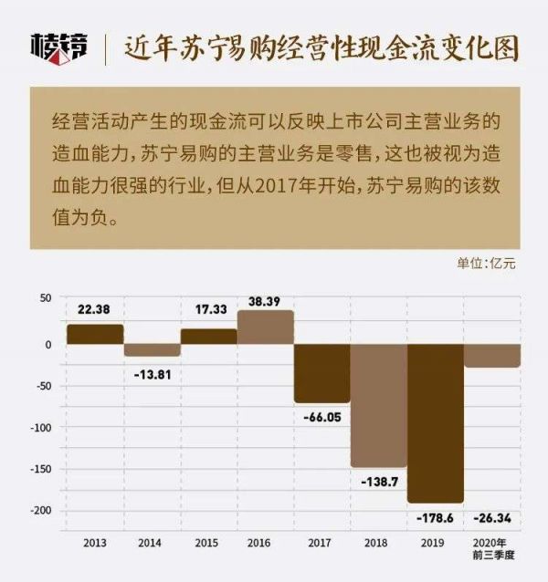 根据财报,2017年-2019年,苏宁易购的经营活动分别净流出66亿、139亿和178.65亿,2020年前三季度的净流出额也有24亿元。