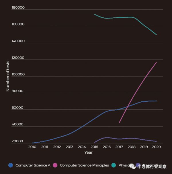 不足为奇的是,随着学习计算机科学的障碍已经下降,该学科的入学人数激增。管理高级中学课程的大学委员会(College Board)看到,参加计算机科学A考试的学生人数从2010年的约2万人飙升至2020年的7万多人——这是大学委员会在这十年里30多个科目中增长最大的一个。该组织还于2017年推出了一门计算机科学原理课程,该课程首次面向4.4万名高中考生,并在2020年增至近11.7万人(见图3和图4)。计算机科学的普及率的增长并没有反映在与硬件工程相关的其他科学中,大学委员会的数据显示,过去十年来微积分考试的考生几乎持平,化学水平几乎没有上升,物理水平也在下降。