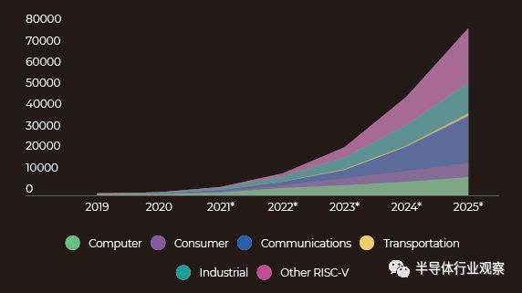 在与RISC-V基金会合作的一个市场研究项目中,Semico在2019年末估计,到2025年,RISC-V将占据工业总核心消耗量的4.5%。考虑到其相当保守的方法(从目前的调查数据线性推断),它可能低估了RISC-V的增长。