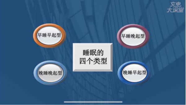 第一节课讲述的睡眠认知,内容是辨别睡眠的四个类型,包含早睡早起型、早睡晚起型、晚睡晚起型和晚睡早起型。整个视频花了20分钟讲解这四种睡眠情况的区别,但实际上,即便不看视频,普通人也很容易能够自身辨别这些情况。