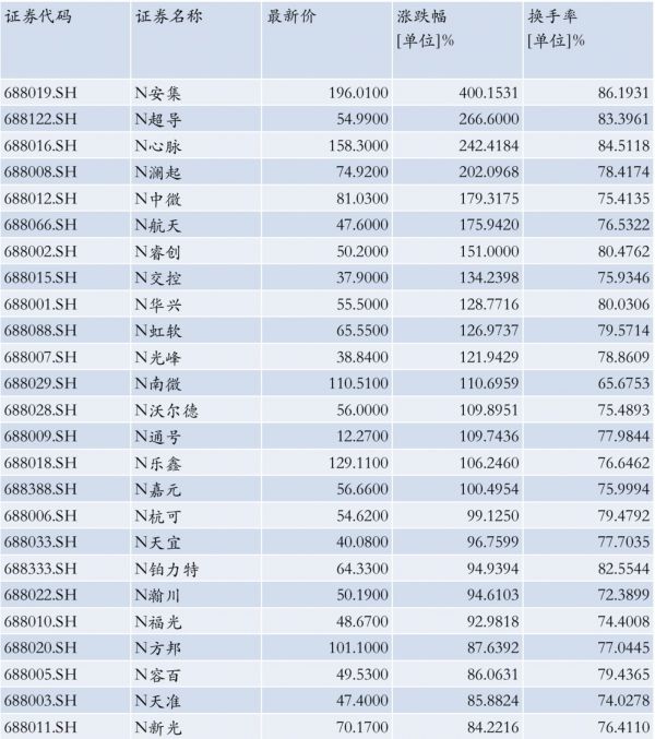 25家公司首日开盘涨幅都超过44%,最高的安集科技开盘涨幅达287.85%,最低的新光光电也有57.52%,18家公司开盘涨幅超过100%。