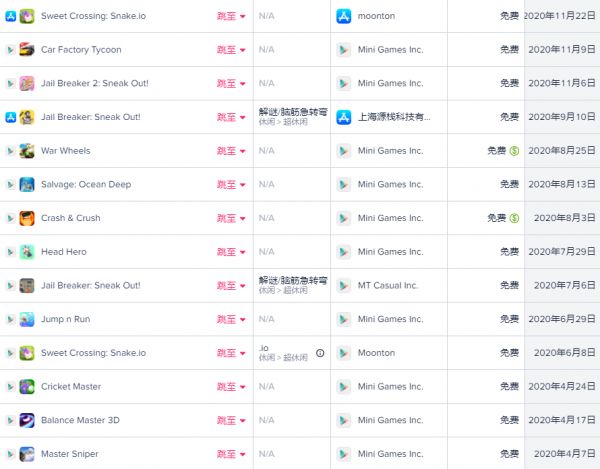 沐瞳科技成立以来,推出游戏的频率并不高,但是在2020年却疯狂地发布了57款游戏。这些产品多为休闲游戏,并且绝大部分都只登陆了 Android 平台。现今这些游戏大多数已经下架,只留下了12款。这些游戏多表现平平,贪吃蛇玩法的《Sweet Crossing: Snake.io》还算不错,在东南亚市场主要国家曾进入 Google Play 游戏下载榜 Top10。
