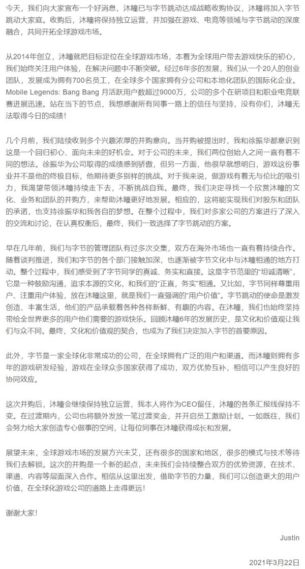 据游戏新知了解,沐瞳科技被收购之后仍将保持独立运营,但其创始人及最大股东徐振华或将退出。而在沐瞳科技CEO袁菁(Justin)发给全体员工的邮件中(文后附邮件全文《加入字节跳动,开拓全球市场》)也提到了这一点。