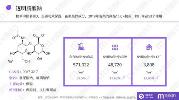 美修大数据显示,2019年新增化妆品备案商品中,有16万+商品使用了透明质酸纳成分(玻尿酸的钠盐形式)。同时,美丽修行的TOP100热门商品中,53%的商品添加了透明质酸钠,同比增长了近40%。