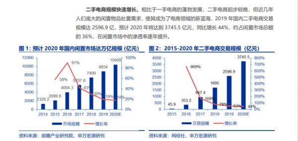 预计2020 年二手电商交易规模将达到 3745.5 亿元,同比增长 44%,用户数量将达 1.82 亿人。
