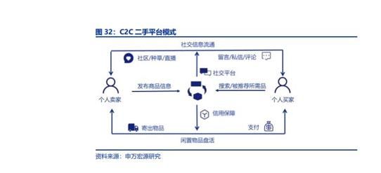 C2C 模式中,二手电商是买卖双方物品交易和社交信息流通的平台,适用于非标品转让。个人卖家通过图片、视频、文字在平台上发布商品信息,并以社区、种草或直播的营销方式获得更大的曝光率。个人买家通过搜索或算法推荐获取所需品,在下单前双方通常会以留言、私信的方式进行品质、价格、邮费、退换等方面的磋商,协商一致后由卖家自行邮寄物品。