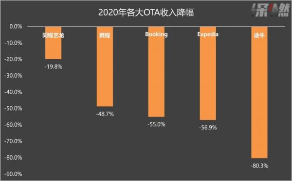 全球OTA(在线旅游平台)巨头Booking、Expedia的收入都是腰斩,抗风险能力很强的携程收入降幅也达48.7%,途牛更是下滑了80.26%。同程艺龙是受影响最小的,收入下滑了19.8%。