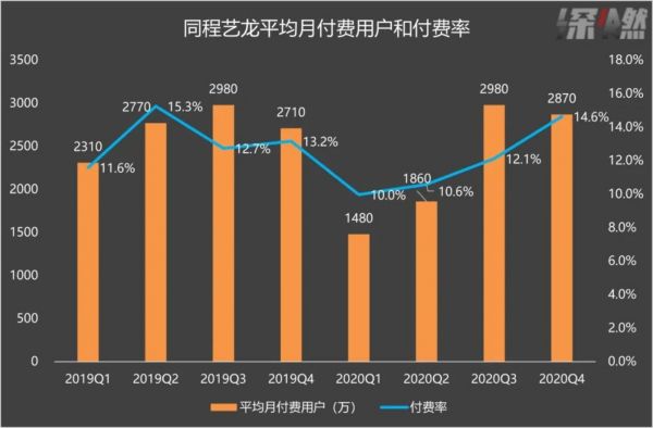 同程艺龙的用户增长速度同样高于行业大盘。2020年三季度,同程艺龙的月活用户达2.46亿,已经超过2019年同期的2.34亿。而在平均月付费用户数量上,四季度达到2870万,付费率高达14.6%,超2019年同期。