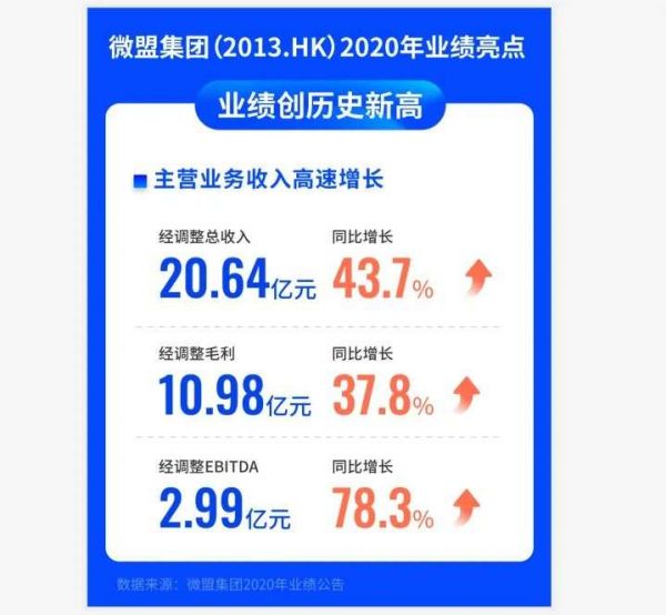 3月17日,港股新经济SaaS龙头微盟集团(2013.HK)发布了2020年财报。数据显示,2020年微盟集团经调整总收入20.64亿元人民币同比增长43.7%,调整后净利润1.08亿元人民币同比增长39.1%,连续三年实现经营性盈利。