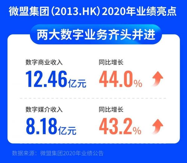 作为港股SaaS企业代表,微盟集团连续三年实现经营性盈利与两大数字业务的增长密不可分。反映在数据上,2020年微盟数字商业收入12.46亿元人民币,同比增长44%,数字媒介收入8.18亿元,同比增长43.2%,增速迅猛。