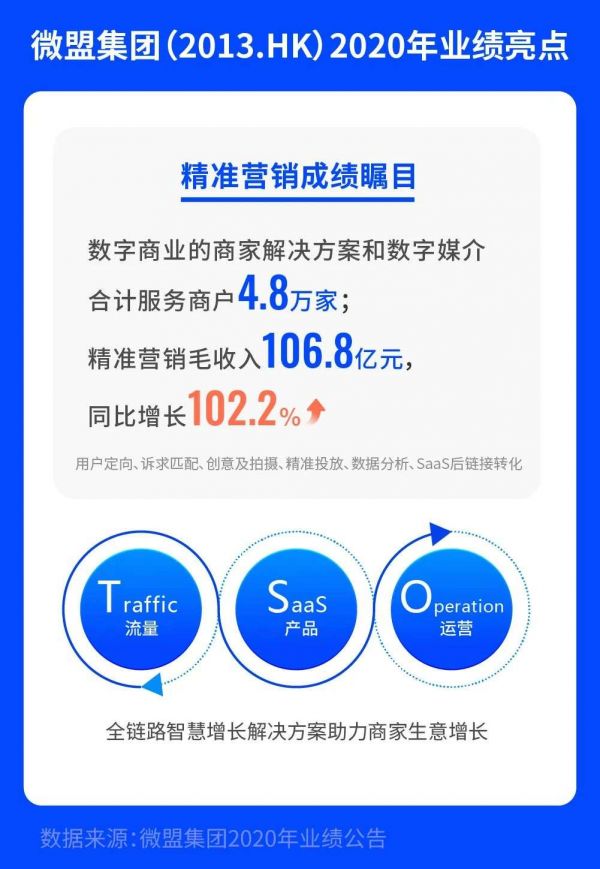 增效方面:通过为商家提供从数据分析、诉求匹配、创意及拍摄、流量投放、SaaS系统转化与留存的一站式运营闭环,微盟得以进一步实现智能经济营销的全链路价值。