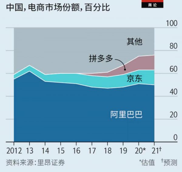 这种转变在中国走得最远。中国最大的两个数字集团阿里巴巴和腾讯已经在多个市场上相互竞争,同时还要与新兴对手竞争。券商中信里昂的数据显示,阿里巴巴在中国电商市场的份额在2013达到62%的顶峰,去年为51%(见下图)。一度分散的竞争正在集中化。紧随其后的两家公司拼多多和京东总共占领了24%的市场。中信里昂估计到2026年该比例会达到33%。腾讯的微信支付和阿里巴巴的支付宝一直在竞争成为中国购物者首选的数字钱包。2020年,腾讯宣布将在未来五年内投资5000亿元,一部分将用于在云计算领域追赶阿里巴巴。