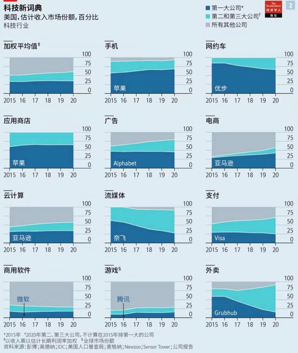 美国科技业的格局也开始发生变化。经济学人研究了美国11个大型科技市场,它们去年的总收入共计1.6万亿美元。根据计算(不可避免地包含一些估计),在过去的五年中,在应用商店、商业软件、云计算和在线广告领域排名第一的公司的市场份额一直没有增长。2015年以来,在外卖、网约车和视频流媒体领域排名第一的公司的市场份额有两位数的下降。