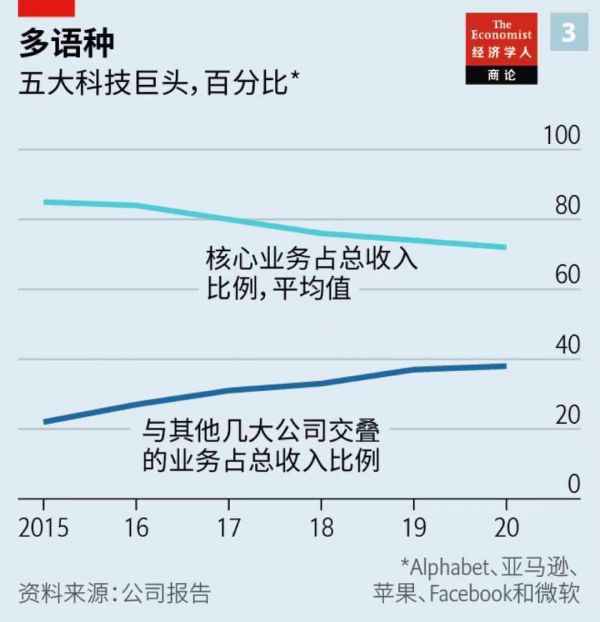 核心业务让出的那些份额正由越来越多的新业务填补。许多新业务需要五大巨头涉足彼此的领域。现在,它们收入的近五分之二来自存在交集的业务,在2015年时为五分之一(见下图)。根据投行伯恩斯坦公司(Bernstein)的说法,如果将科技业划分为20个左右的业务领域,从智能手机、智能音箱,到即时通信和视频会议等,那么每个巨头都会出现在其中大部分领域中。