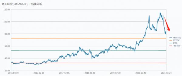 食品饮料中,白酒前期跌幅很猛,当前处于盘整状态。但酱油茅——海天味业还在走大杀浪,较历史高点回撤32%,估值倍数从年前的115倍回撤至当前的78倍。可见这些龙头此前被疯炒,估值泡沫得有多大。