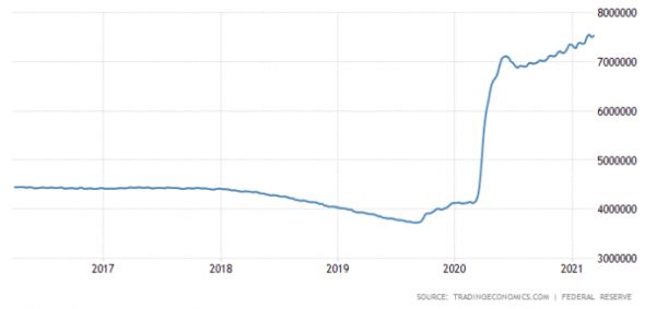 去年年初,美联储资产负债表为4.25万亿美元,到年末已经飙升至7.5万美元,大幅扩表3.25万美元。这相当于去年一年美联储印钞3.25万亿,这还是基础货币。算上货币乘数的话,去年美国货币增量约为11万亿美元,去年一年美国印钞量就占美元总量的34%。