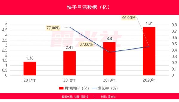 乍一看,这是一个相当不错的用户数据。甚至如果把时间线再放长一些,过去四年来,快手的用户月活基本保持着高速增长态势,一路从2017年的1.36亿增长至2020年的4.8亿,特别是去年的增长十分可观。