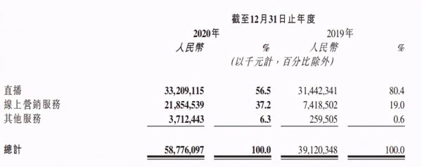 2020年,快手上线了综合线上营销平台。得益于此,其线上营销服务收入全年达到219亿,并在总收入中的占比从2019年的19%提升至37.2%,成为了快手新的增长引擎。