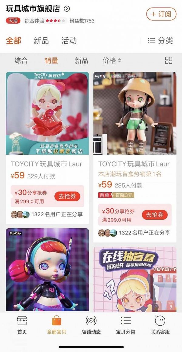眼下,几乎所有潮流玩具生意都会用盲盒模式引流。界面新闻搜索其天猫官方旗舰店发现,在定价上,ToyCity盲盒售价在49-69元之间,而潮流手办系列定价在500元到1.2万元之间。从销量上看,盲盒类产品是其销售主力,而潮流手办产品月销量都在个位数。其中卖的最好的一款Laura花卉公仔盲盒,售价59元起,月销量达500+。