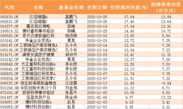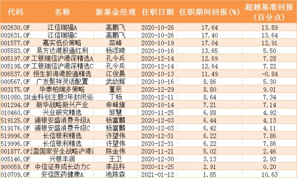 如果从基金产品所属的基金公司来看,博时基金旗下的产品获得正收益的最多。博时科技创新、博时研究优选、博时逆向投资、博时科创主题3年封闭和博时睿利事件驱动等五只基金产品中,新上任的赵易、吴鹏等5位新手业绩不错。工银瑞信基金旗下的工银瑞信沪港深精选、工银瑞信红利优享、工银瑞信全球配置旗下上任的新人孔令兵同期也都实现了正回报。此外,江信基金、方正富邦基金、浦银安盛等基金公司旗下新上任的基金经理也是如此。