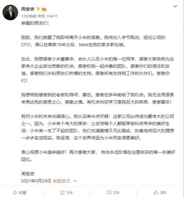 钛媒体快讯|3月24日消息:刚刚宣布辞去小米执行董事、国际部总裁的周受资发文公布了个人去向,将加入字节跳动任CFO,“base在新加坡”。