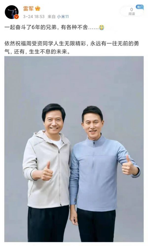 随后,雷军发文对这位“一起奋斗了6年的兄弟”表示“不舍”,并祝福周受资“人生无限精彩,永远又一往无前的勇气,还有,生生不息的未来。”