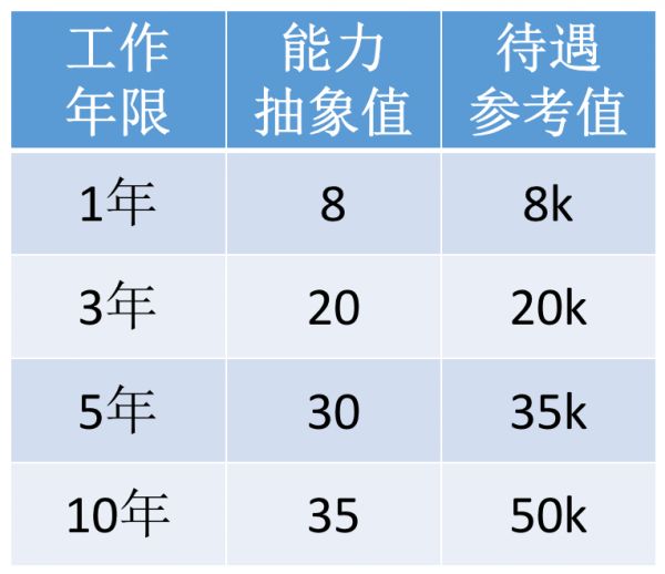 本段最终是想抽象出下表,举例说明薪资性价比: