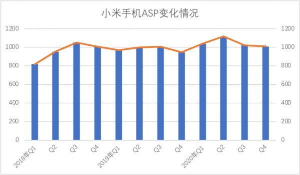 在过去三年时间里,小米手机的ASP情况整体起伏不大(大多在千元上下),尤其在2019-2020两年时间里,除中间个别季度之外,整体都在同一区间。