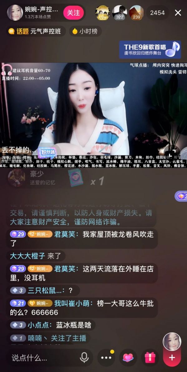 另一位男主播用来制造声音的方式,还包括挤压抱枕、播放音乐盒、摇晃太空沙、敲击化妆品等。也有的主播不显示直播画面,仅仅通过声麦向用户传递使用道具制造的触发音、轻人声或者纯粹的环境音。