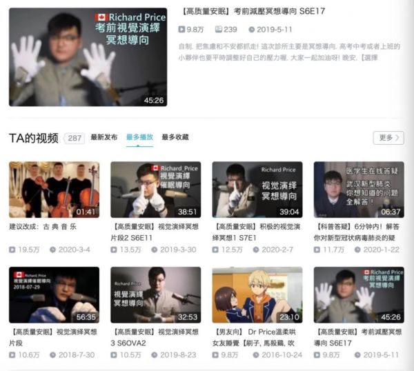 目前,B站也是Richard和国内ASMR创作者的主要阵地。除此之外,他们以往的大部分创作都通过音频上传在喜马拉雅、网易云、echo回声、猫耳FM等音频网站。