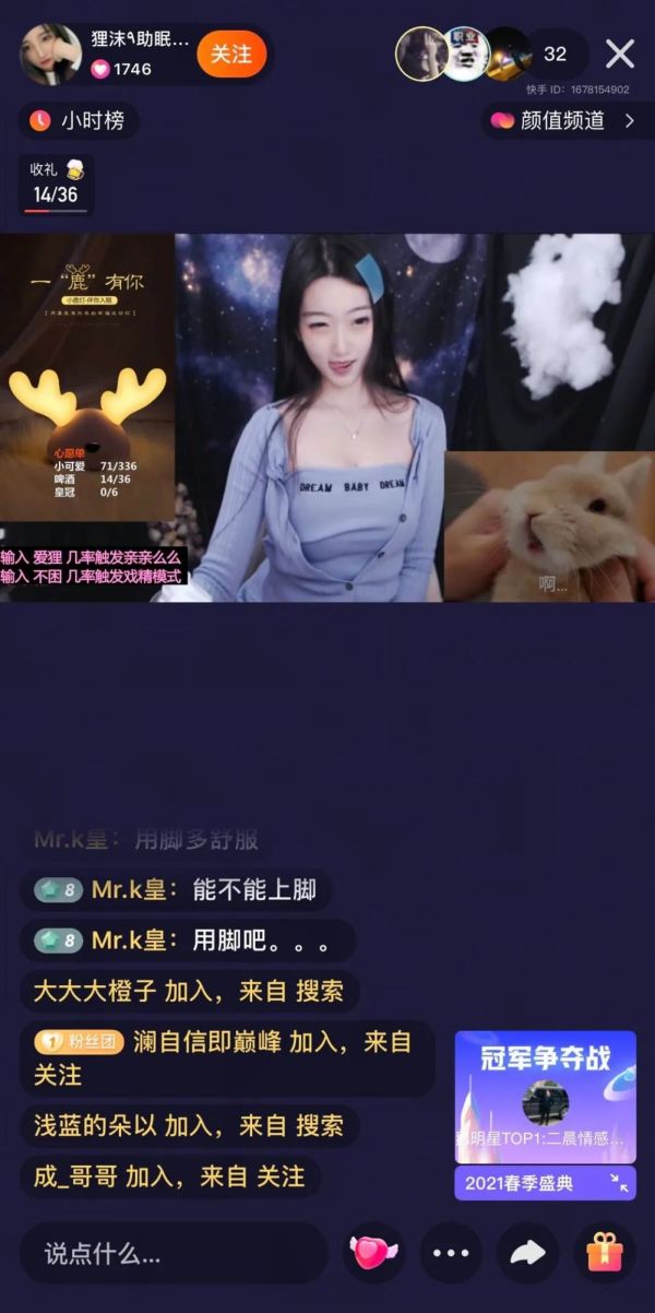 在名为“麦兜筱筱@哄睡,助眠”的快手直播间,主播会不时调整画面,时而露出全脸,时而将画面调整到胸部和腿部,观众可以通过评论要求换视角,通过送礼物点播需求,例如让主播发出掏耳声、咆哮声,赠送更贵的礼物可以要求主播换装或者添加微信。