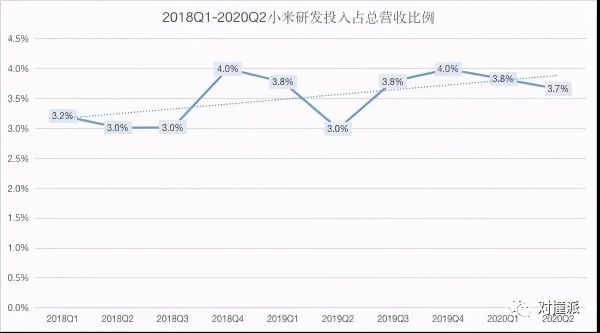 以2020年第二季度为例,在疫情影响下,小米营收增长放缓为3%,但小米研发投入同比增长了26%,在总营收中占比为3.7%。