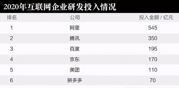 另外,有至少5家互联网公司在研发上的投入也远超小米。阿里2020年研发投入为545亿元,腾讯为350亿元,百度为195亿元,京东为170亿元,美团为110亿元。