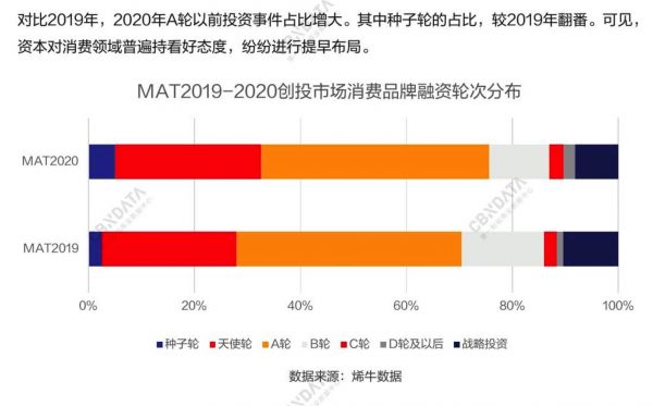 在年初疫情的影响下,2020年上半年针对新消费品牌的投融资总额同比上升了142%,全年投融资事件中,种子轮的占比较2019年翻番,足见资本对新品牌拥有信心。