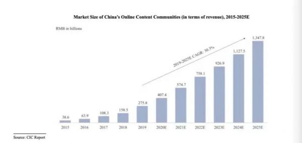 这份招股书中知乎引用了来自CIC的报告:中国互联网内容社区的市场规模从2015年的386亿人民币增加到2019年的2758亿人民币。2025年这一市场预计将增长到1.3万亿人民币。同时,中国互联网内容社区用户群已从2015年的5.162亿大幅增长至2019年的7.73亿,预计到2025年将进一步增加到10亿。
