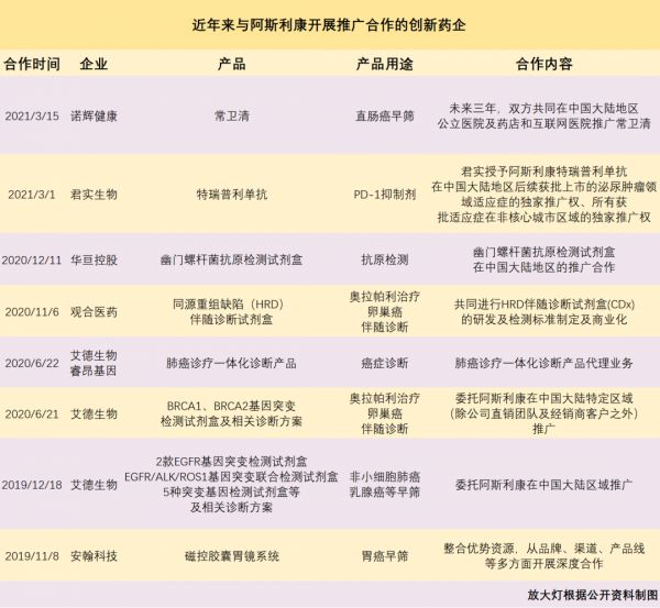 放大灯团队发现,甘心“交饭碗换饭票”的不止这两家。过去几年,观合医药、艾德生物、睿昂基因、安翰科技等一大批本土创新药企都与阿斯利康签署了推广协议。这些企业的业务覆盖了癌症早筛、伴随诊断、抗癌创新药等多个领域。