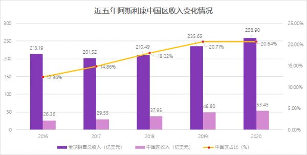 销售推广体系让阿斯利康在中国收获颇丰。2020年,阿斯利康中国实现了53.45亿美元的销售额。这个收入规模和比例,是跨国药企的翘楚。