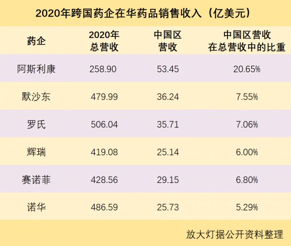 1993年进入中国市场的阿斯利康,在全球药企排名没进前十,但能在中国市场拿到第一。2020年,阿斯利康的全球业绩为258.9亿美元,在华营收比例超20%,达到53.45亿美元,同比增长10%,成为该公司仅次于美国的第二大市场[5]。是本土化最为成功的跨国药企。