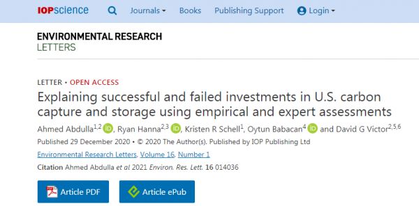相关研究以 “Why Commercialization of Carbon Capture and Sequestration has Failed and How it Can Work” 为题,发表在《环境研究通讯》(Environmental Research Letters)杂志上。