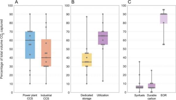 专家们达成共识,就数量而言,CCS 将优先部署在发电厂,其二氧化碳捕获量大约是工业现场 CCS 的两倍。但是,工业 CCS 站点(点数较小的变暖气体源)数量会更多。此外,捕获的二氧化碳更有可能被利用,而不是被隔离在专用的储层中。这也揭示了专家们对诸如合成燃料生产和耐用碳等新型利用选择的怀疑态度。