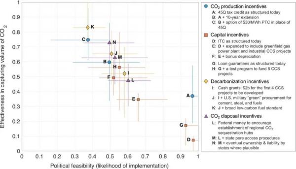 图 | 对可提高 CCS 项目可行性的四组政策工具的有效性和政治可行性进行的专家判断(来源:Environmental Research Letters)